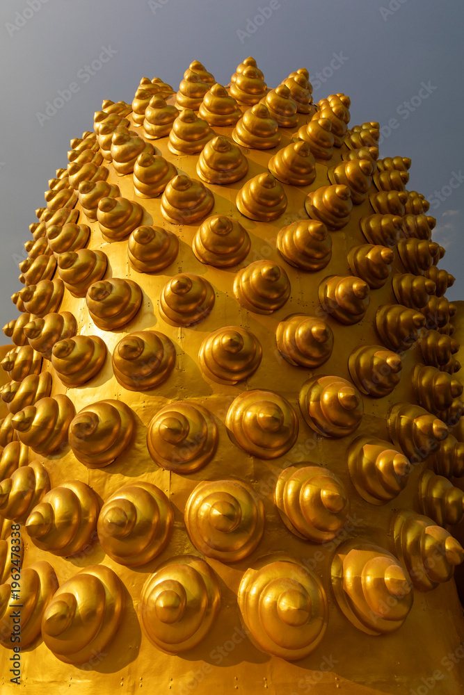 Close up back view of large golden Buddha head with spiral shell hair pattern. #1962478338