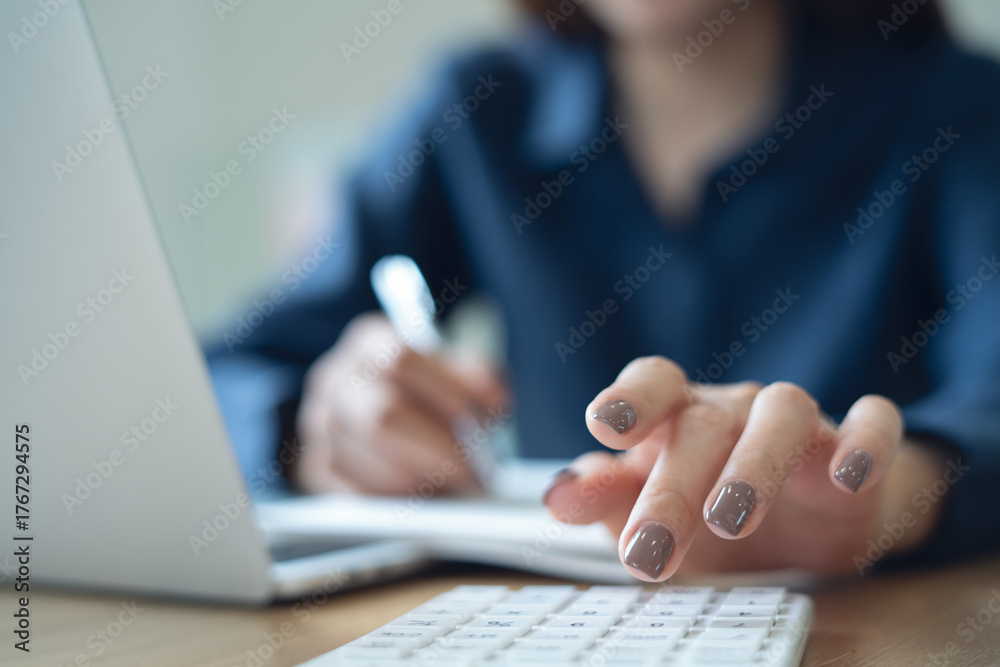 Close up business woman working, using calculator to calculate budget and tax with laptop computer on office table, accounting, budget management. Doing finance, budgeting and tax calculation. #1767294575
