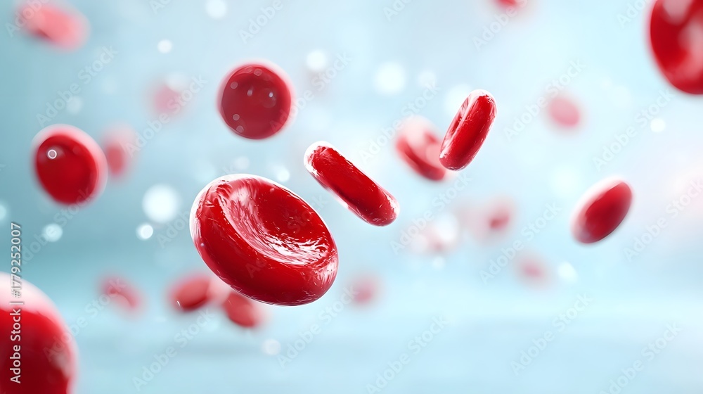 Close up 3D illust n showcasing red blood cells erythrocytes in motion set against a softly blurred blue background with light speckles representing biology health and vital bodily functions #1779252007