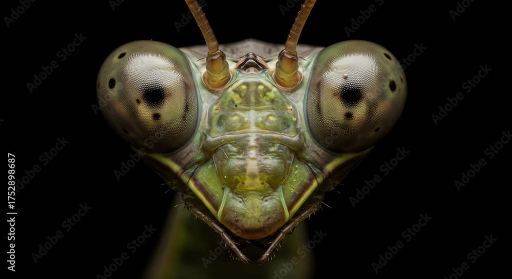 Close Up Detailed Image of Green Praying Mantis Head with Large Eyes and Antennae on Black Background #1752898687