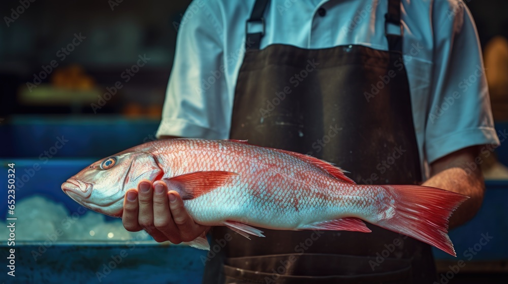 Close up fisher seller with apron holding raw fish for selling on seafood market #652350324