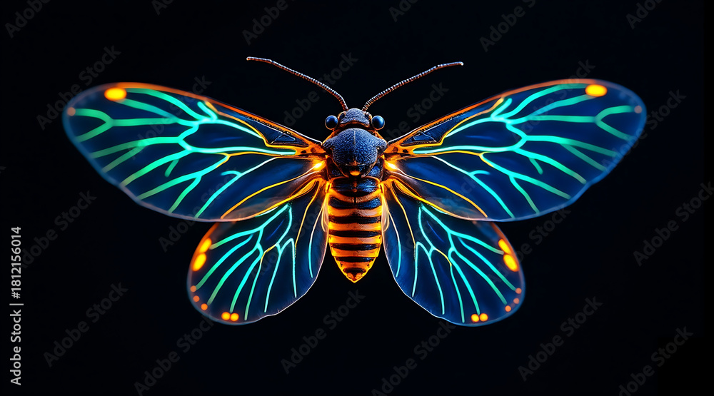 Close up glowing cicada with transparent wings showing vibrant blue and orange patterns against dark background, highlighting intricate details #1812156014