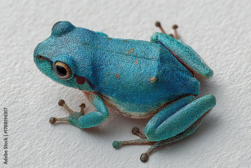 Close-up image of a small blue frog with striking texture and color detail on a smooth white background. #1788196317