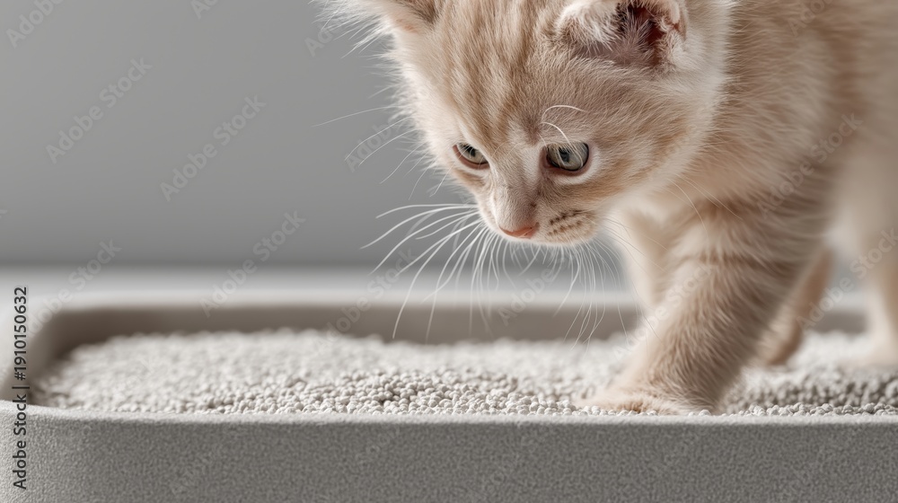 Close up kitten in litter tray highlighting granule texture and pet hygiene product category. Cat care industry, veterinary support, domestic animal market #1910150632
