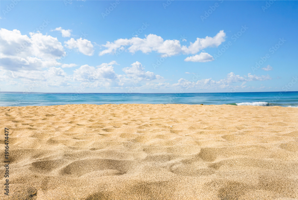 Close-up low-angle view of clean, golden sand on bright tropical beach. Horizon view of deep blue sea and clear sky with light clouds and wide copy space. Ideal summer vacation background and texture. #1916474477