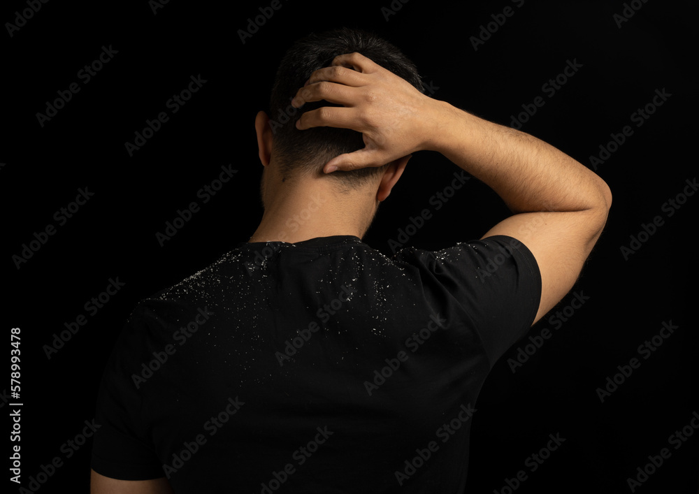 Close up low key portrait of man with dandruff or itchy hair problem. Concept of hair care, dandruff and seborrheic dermatitis. #578993478