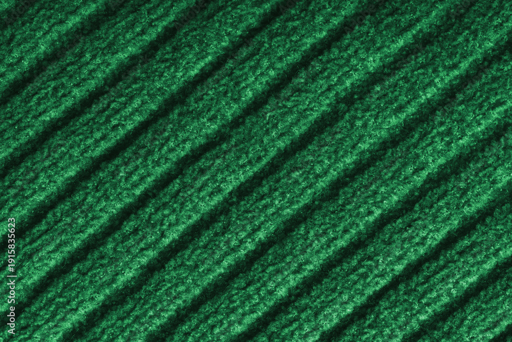 Close up, macro of green colored knitted fabric with diagonal relief ribbed pattern and soft wool texture. Detailed textile surface, knitwear background, fashion, backdrop, design element. #1915835623