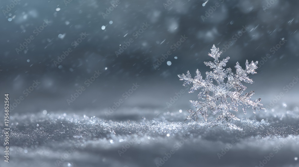 Close-up of a beautiful snowflake resting on pristine white snow, showcasing intricate ice crystal patterns and delicate frost details in a winter wonderland scene, perfect for seasonal backgrounds an #1756852564