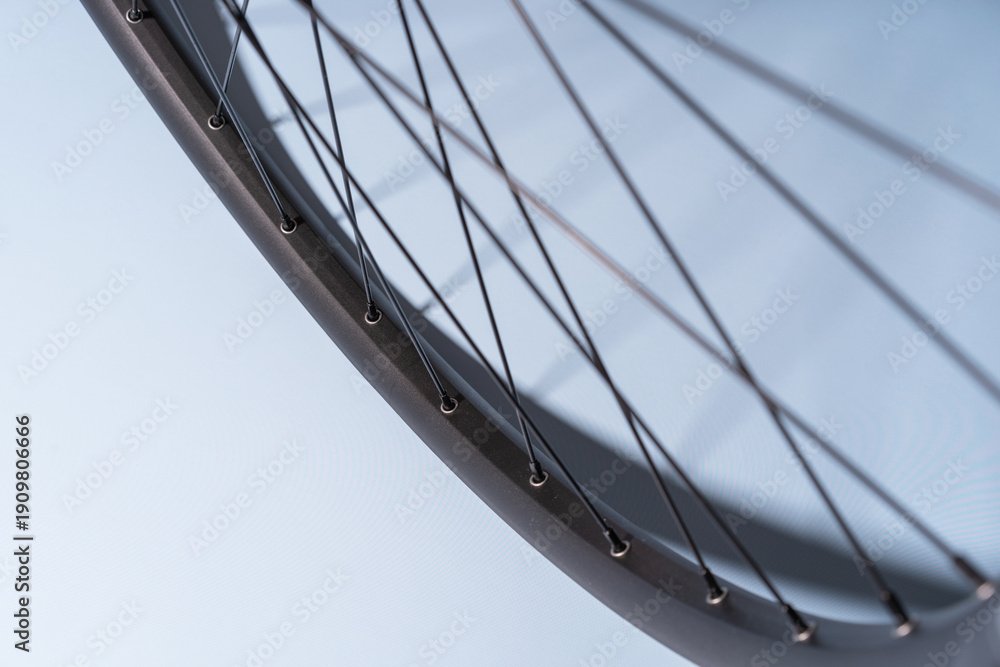 Close-up of a black bicycle rim with evenly spaced spoke holes and crossed spokes against a light blue background. #1909806666