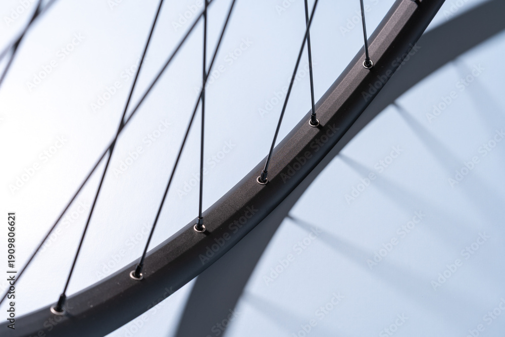 Close-up of a black bicycle rim with metal spokes casting shadows on a light blue surface. #1909806621
