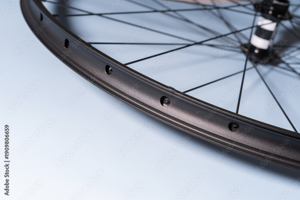 Close-up of a black bicycle wheel rim with spoke holes and tensioned spokes on a blue background #1909806659