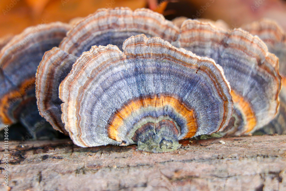 Close up of a blue and orange turkey tail mushroom (Trametes versicolor) #311130984