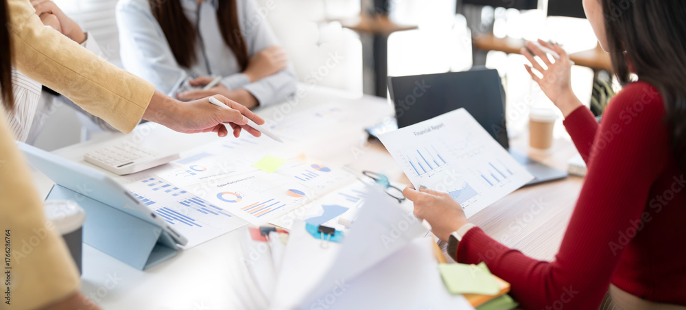 Close-up of a business team collaborating, analyzing financial documents and charts during a meeting in the office. #1766286764