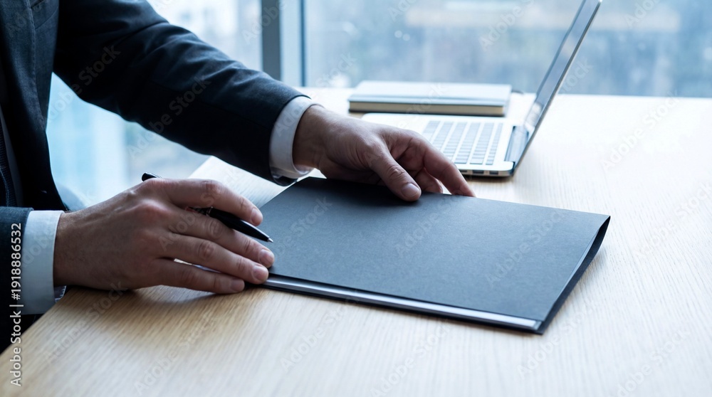 Close up of a businessman in a dark suit holding a black folder and a pen while working near a modern laptop computer. #1918886532