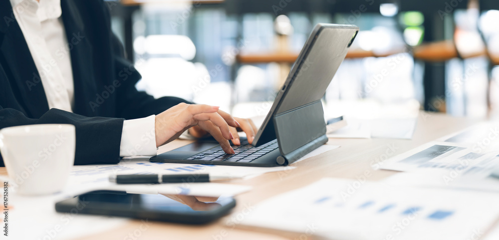 Close-up of a businesswoman's hands typing on a tablet keyboard during a professional meeting or while working in an office environment. #1767526382