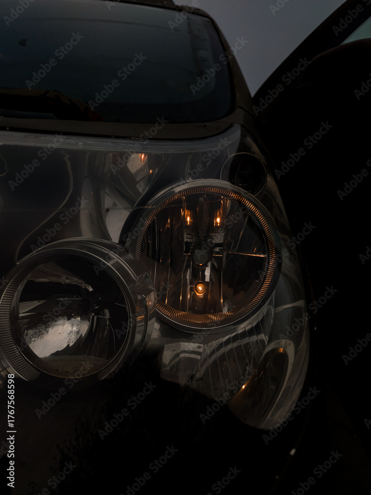 Close-up of a car's round, reflective headlight and turn signal glowing amber in the deep twilight or dark, conveying mystery, travel, or late-night driving. #1767568598