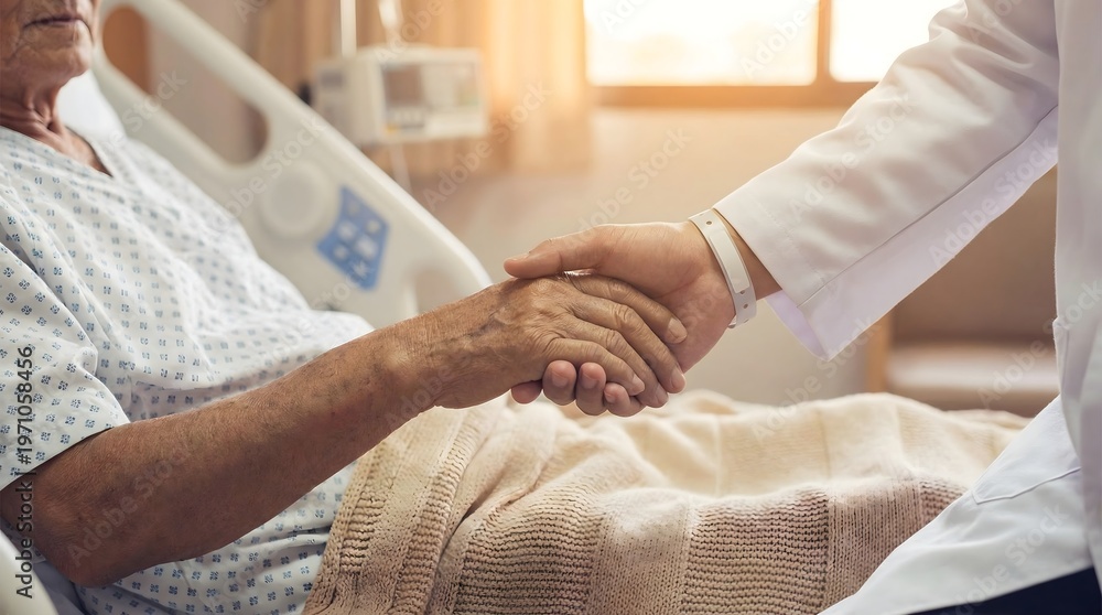 Close-up of a doctor in a white coat holding the hand of an elderly patient in a hospital bed, representing compassion, care, and medical support #1971058456