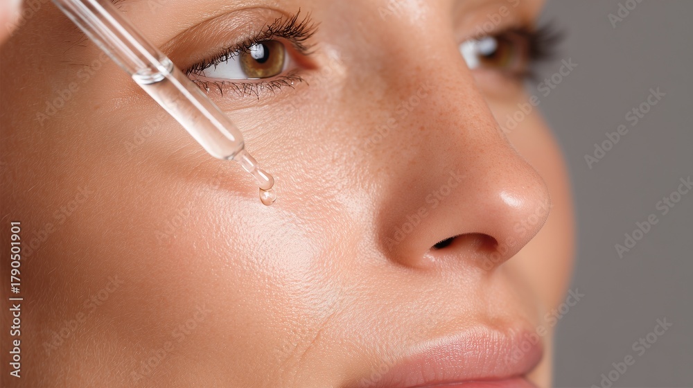 Close-up of a dropper applying retinol serum on a woman's face, symbolizing skincare and rejuvenation. #1790501901