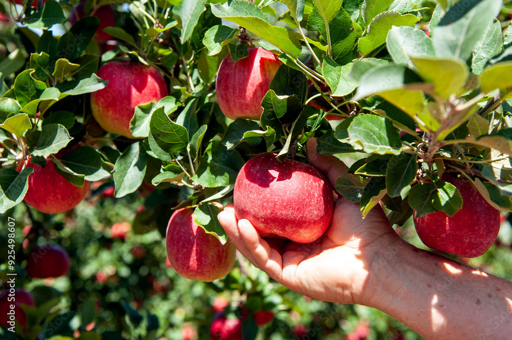 Close-up of a farmer's hand picking an apple in an orchard #925498607