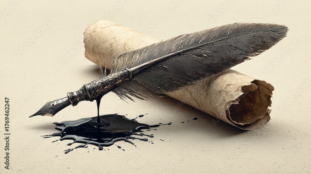 Close up of a feather quill with ink blot and rolled parchment on a neutral surface #1769462247