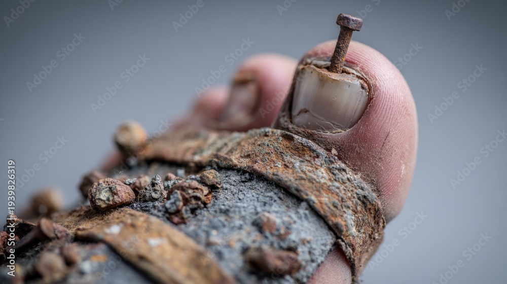 Close up of a foot with toenail fungus showing signs of decay and damage near sharp objects in an outdoor setting #1939826319