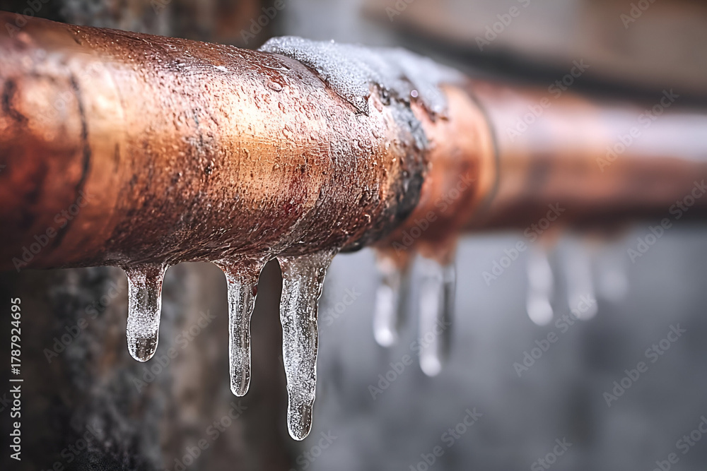 Close-up of a frozen copper pipe with icicles, showcasing the effects of cold weather on plumbing. #1787924695