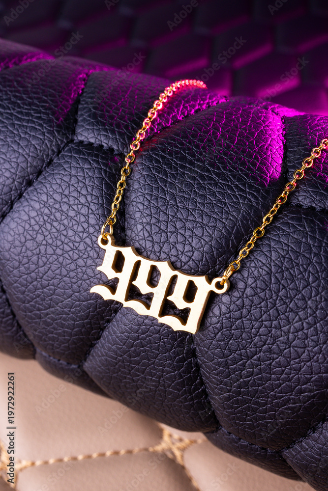 Close-up of a gold pendant with the number 999 on a chain, set against a luxurious black leather background. #1972922261