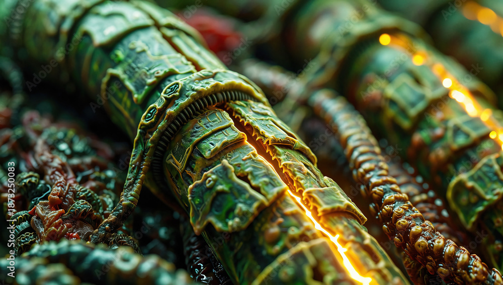 Close-up of a green lobster tail with intricate texture and golden highlights #1873250083