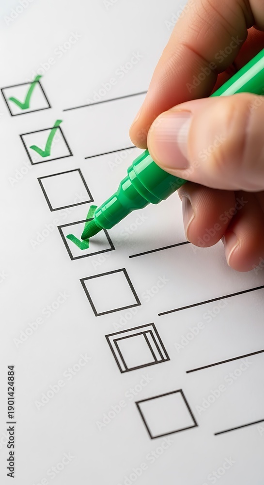 Close-up of a hand using a green marker to tick off items on a checklist, task completion. #1901424884