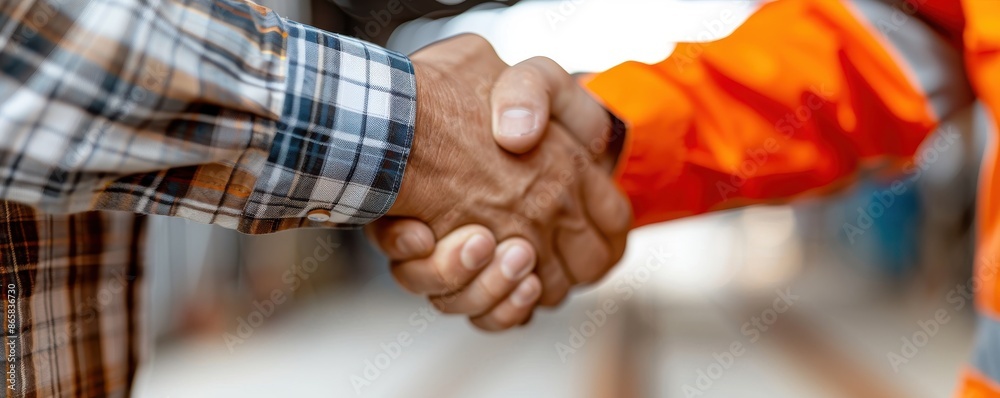 Close-up of a handshake between two people wearing casual and work attire, symbolizing partnership, agreement, and cooperation. #865836730