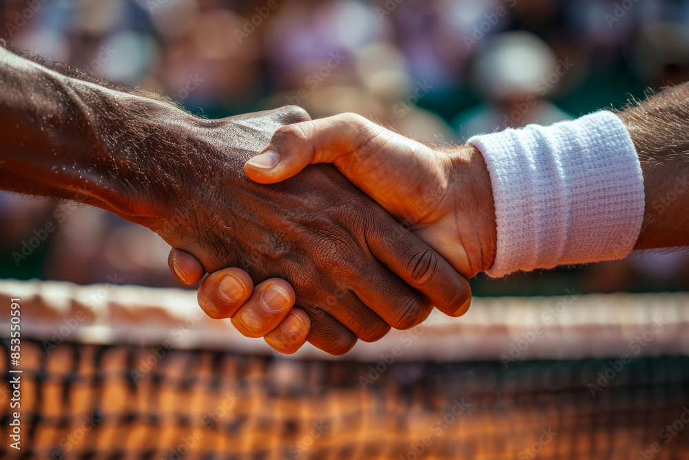 Close-up of a handshake over a tennis net, symbolizing sportsmanship and unity. The diverse hands emphasize equality and mutual respect in sports. #853550591