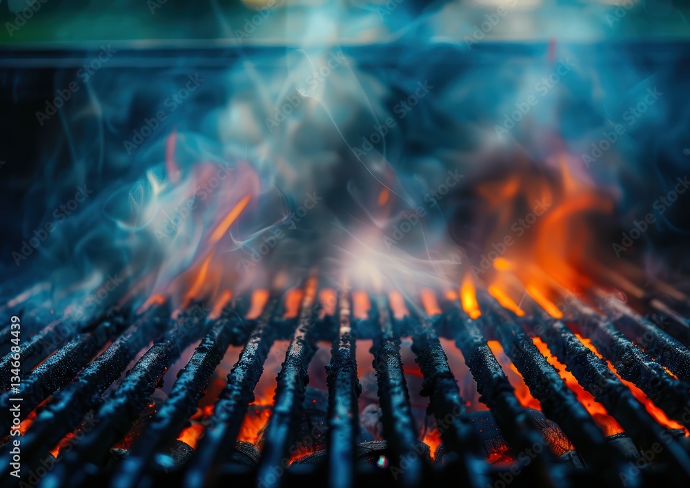 Close-up of a hot, smoking barbecue grill with glowing embers. #1346684439
