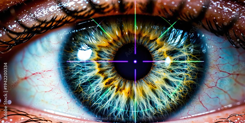Close-up of a Human Eye with Colorful Iris and Retina Details, Crosshair Overlay #1942200334
