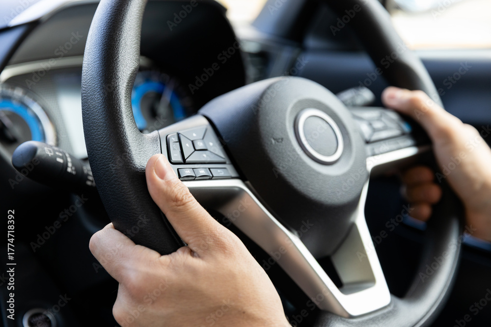 Close-up of a man holding the steering wheel with both hands while driving a car on the left side of the road during the day. #1774718392