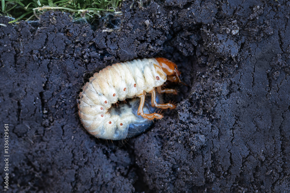 Close-up of a May beetle larva (Melolontha) in the soil. A macro photograph, a detailed image of a large white May beetle larva (Melolontha) wriggling in rich dark soil. #1336129561