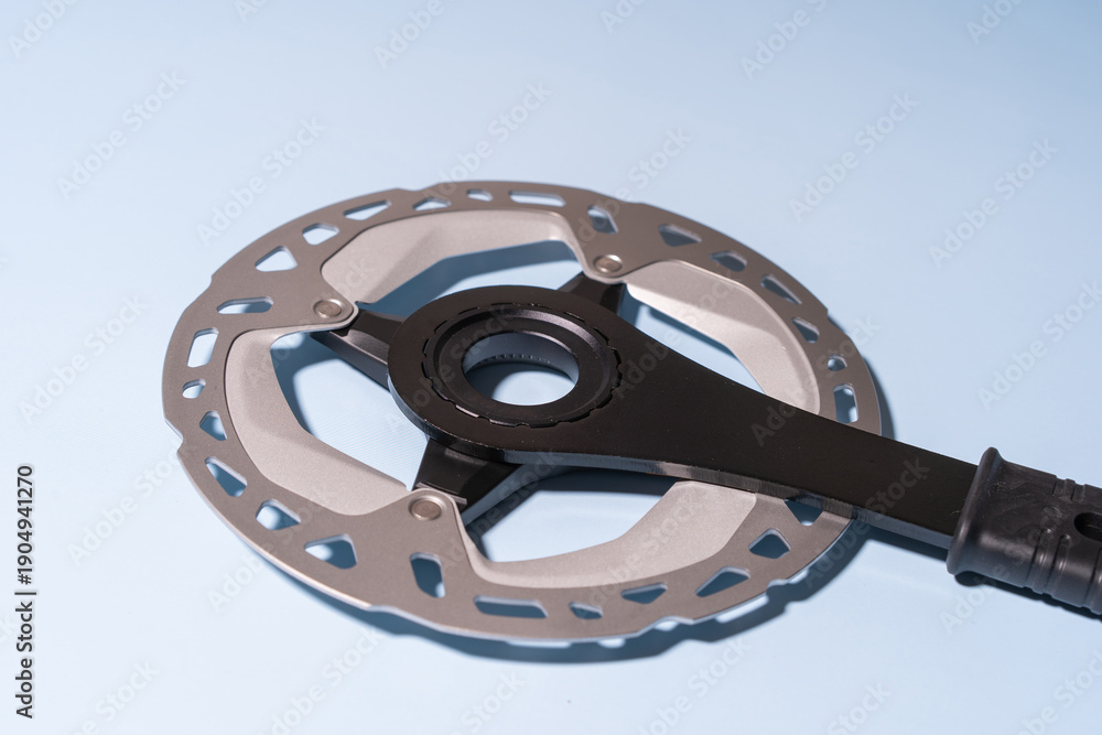 Close-up of a metallic bicycle disc brake rotor attached to a black handle on a blue background #1904941270