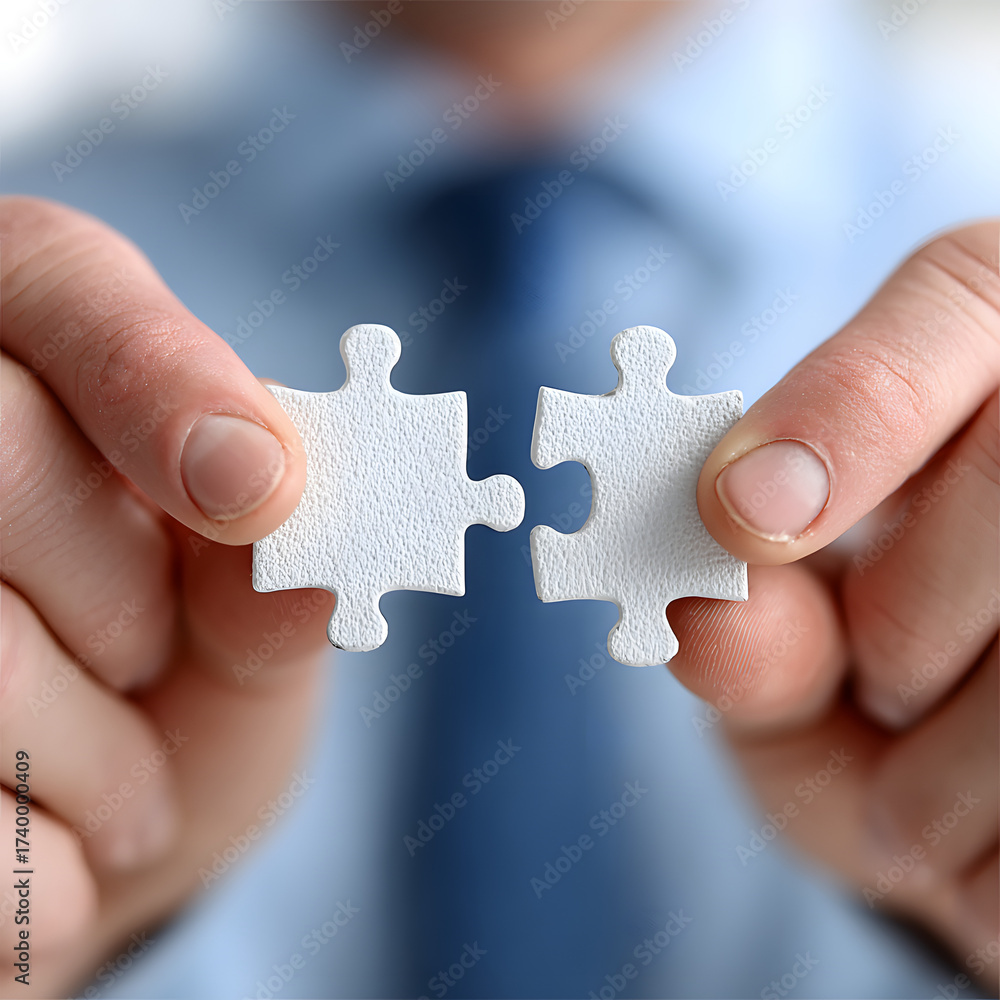 Close-up of a person in business attire connecting two white puzzle pieces, symbolizing teamwork, problem solving, partnership, or strategic planning. #1740000409