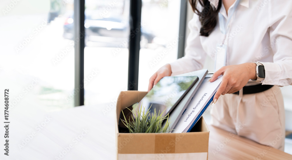 Close-up of a person packing office supplies and a laptop into a cardboard box. #1774608772