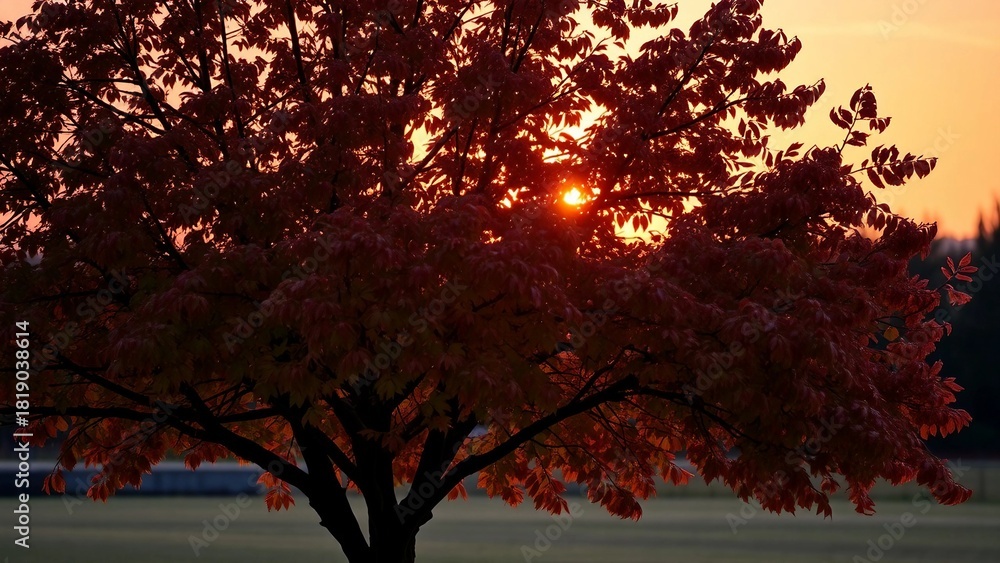 Close-up of a red autumn tree foliage with warm sunlight shining through the leaves, creating a peaceful fall atmosphere. #1819038614