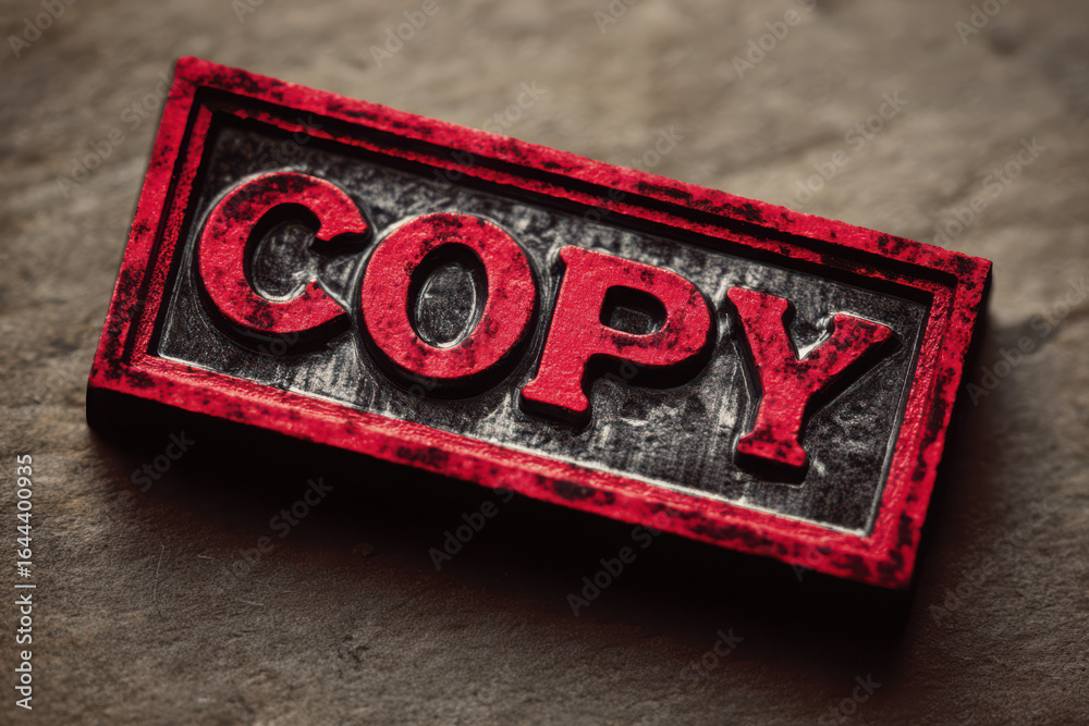 Close up of a red copy stamp with black background on a textured surface in a horizontal format #1644400935