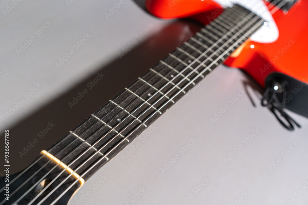 Close-up of a red electric guitar showing the fretboard with metal frets and dot inlays, strings running along the neck, part of the body with white pickguard, and attached black strap. #1936567785