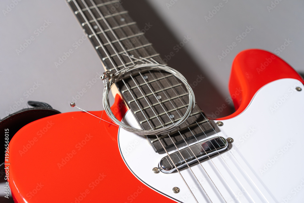 Close-up of a red electric guitar with white pickguard, chrome hardware, dual pickups, bridge saddles, and a coiled set of new metallic strings resting on the body. #1936568015