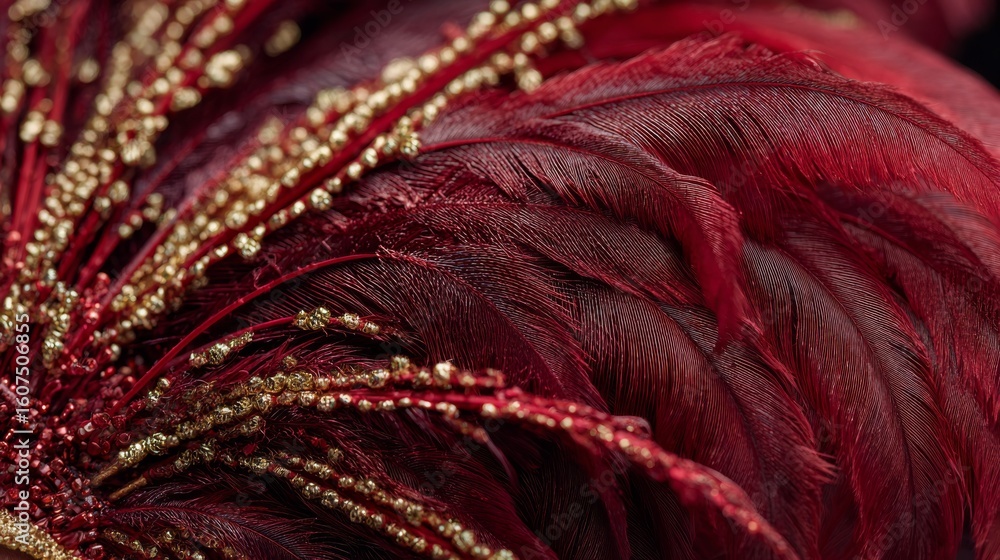 Close-up of a segment of an opera headdress, featuring dyed ostrich feathers in deep crimson, interwoven with gold wire. #1607506855