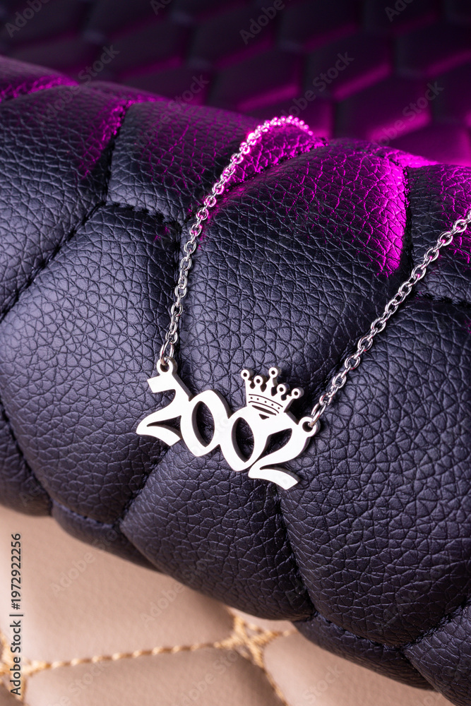 Close-up of a silver pendant with the year 2002 and a cute crown on a chain, set against a luxurious black leather background. #1972922256