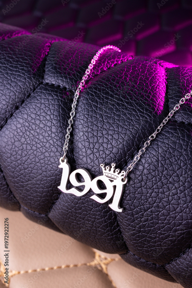 Close-up of a silver pendant with the year 1991 and a cute crown on a chain, set against a luxurious black leather background. #1972922276