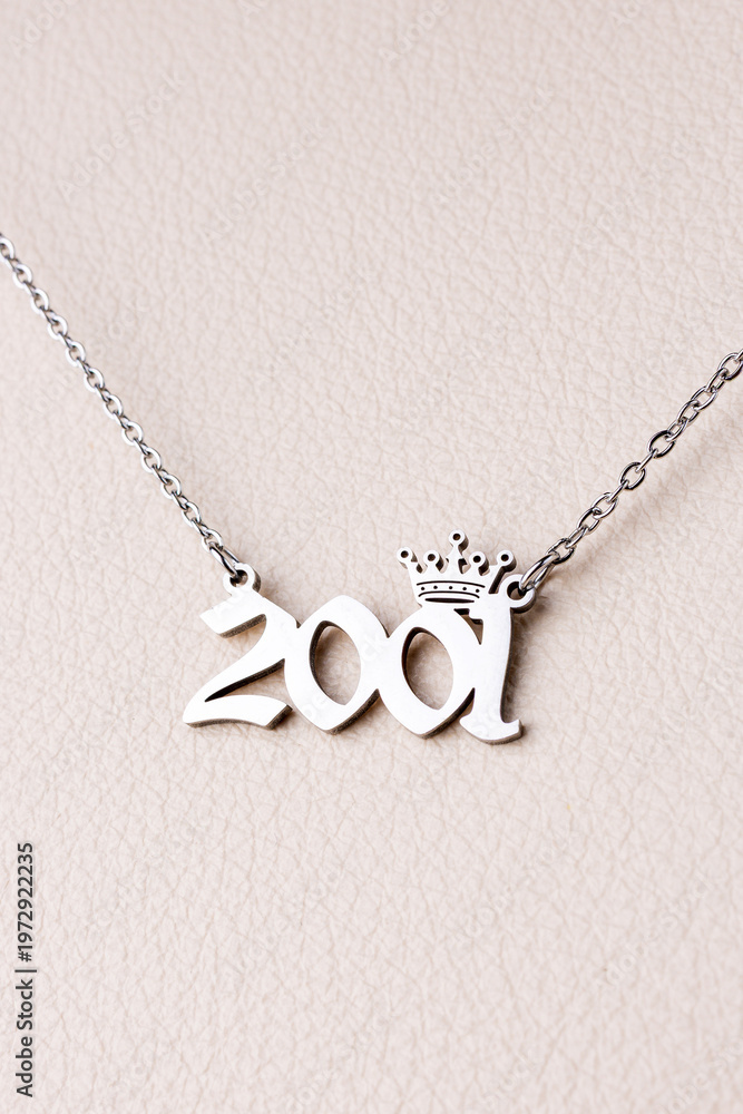 Close-up of a silver pendant with the year 2001 and a cute crown on a chain, set against a luxurious white leather background. #1972922235