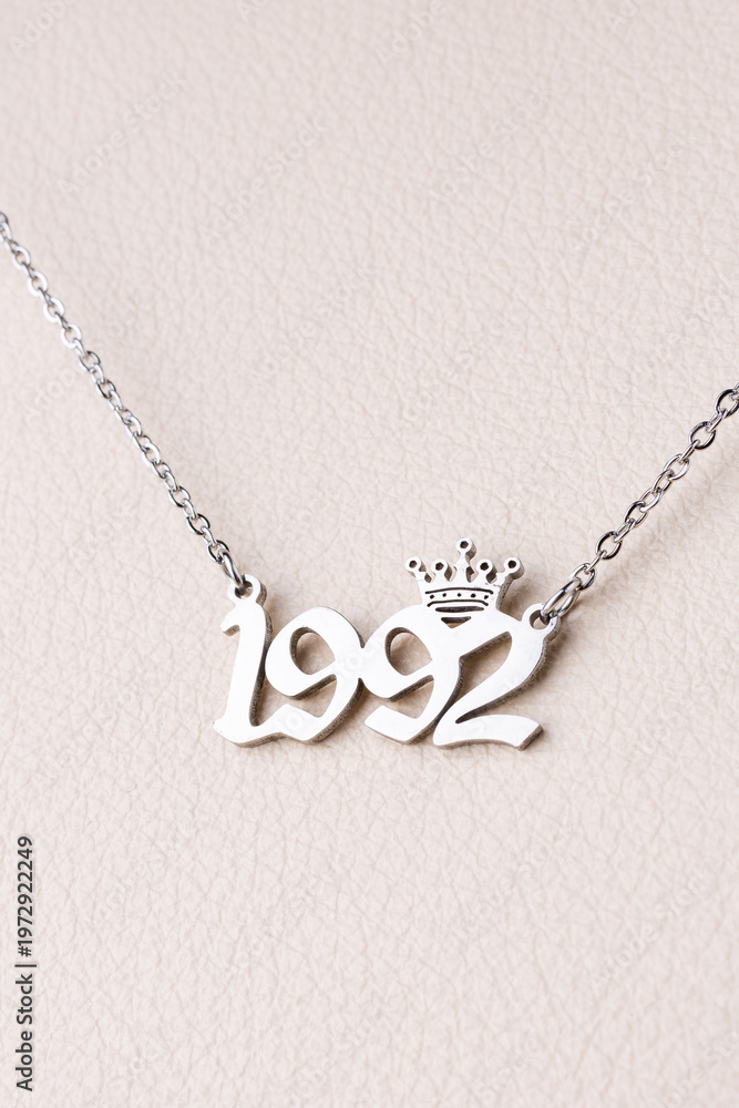 Close-up of a silver pendant with the year 1992 and a cute crown on a chain, set against a luxurious white leather background. #1972922249