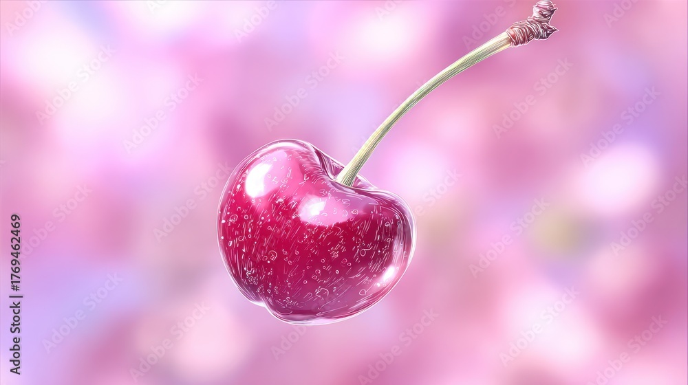 Close up of a single ripe cherry with stem against a soft focus pink background #1769462469
