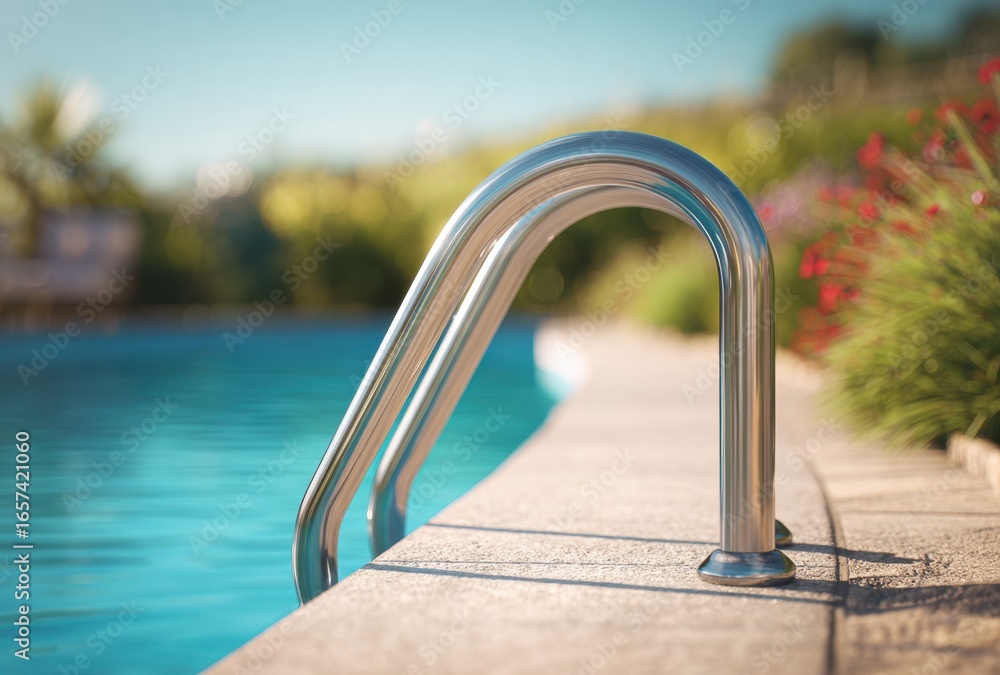 Close-up of a stainless steel pool ladder with curved handrails leading into a clear blue swimming pool on a sunny day #1657421060