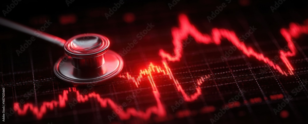 Close-up of a stethoscope and red ECG waveform on a dark background representing medical diagnostics and healthcare technology #1657425660
